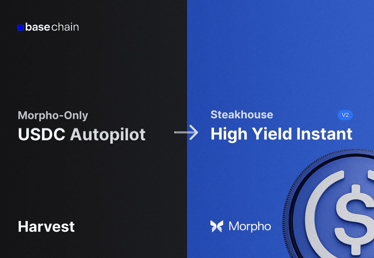 **Harvest Finance has streamlined its USDC Autopilot strategy**, now directing all liquidity exclusively to Morpho's V2 deployment on Base, curated by Steakhouse Financial. **Key changes:** - Previously distributed across multiple V1 and V2 deployments from various curators (Gauntlet, Steakhouse, Anthias, Spark, Yearn, Re7 Labs) - Now consolidated into a single, highly liquid V2 vault on Base - Benefits dozens of Harvest users seeking optimized Morpho positions **What this means:** The Morpho-Only USDC Autopilot automatically routes user funds to top-performing vaults, eliminating the need for manual position management. The shift to a single V2 deployment suggests improved reliability and liquidity concentration. [Learn more about Harvest Finance](https://harvest.finance)