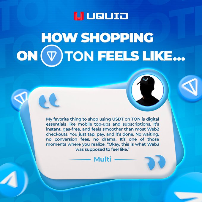 🛒 “Shopping on TON is what Web3's supposed to feel like” — TON Key Voice @Multi_mike01 Fast, gas-free, and smoother than Web2 checkouts. That’s how users are describing payments on @ton_blockchain! 👉 Shop now with TON at t.me/uquidbot & t.me/uquidshopbot