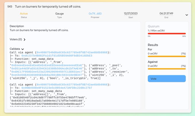 A vote to switch conversion of ETH fees into 3crv back on is up. A potential issue in ETH fee conversion is successfully fixed, now it's safe to be converting them again! P.S. you can vote even on curvemonitor.com/#/dao/proposals - that works as a community-maintained DAO UI
