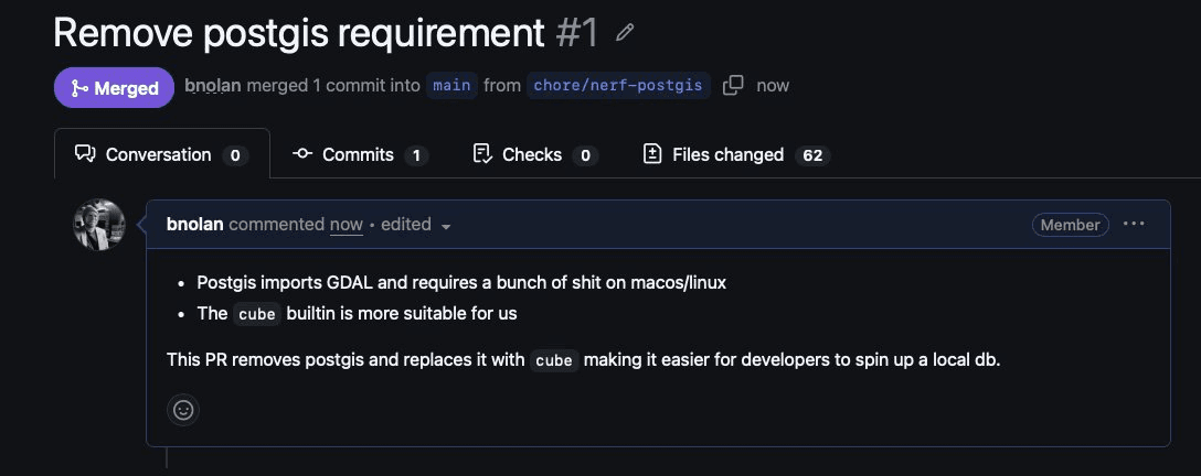 Cryptovoxels has removed the PostGIS requirement from their codebase, making it significantly easier for developers to spin up a local database. **Key Update:** - PostGIS dependency eliminated in latest pull request - Streamlines local development environment setup - Part of broader modernization effort **Recent Modernization:** This change follows a series of technical upgrades including: - Migration from Preact to Svelte - Postgres upgrade from version 12 to 18 - Transition from ILIKE to vector search - Build tool switch from Webpack to Vite These improvements have resulted in server-side rendering, faster loading times, and better compatibility with AI coding assistants like Claude and Cursor. [View Pull Request](https://github.com/cryptovoxels/retro/pull/1)