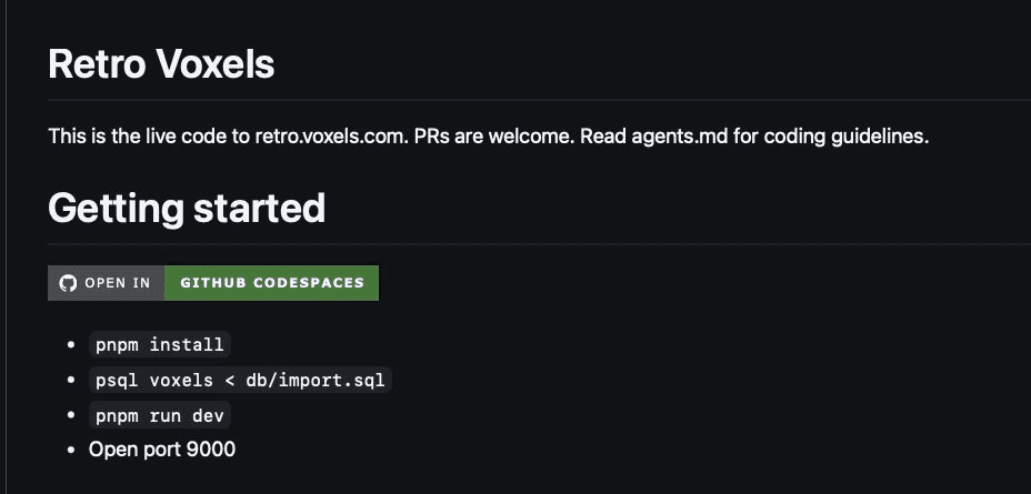 Voxels has integrated GitHub Codespaces into their Retro platform, enabling developers to fix bugs directly in the browser without local setup. **Key Update:** - Browser-based development environment now available - AI-assisted debugging supported through the integration - Code accessible at [github.com/cryptovoxels/retro](https://github.com/cryptovoxels/retro) **Background:** Retro represents the legacy Voxels codebase that continues to run at [retro.voxels.com](http://retro.voxels.com). The team previously announced they've been experimenting with the codebase using Cursor AI to accelerate agentic development workflows. This update lowers the barrier for contributors to participate in Voxels development by removing the need for local environment configuration.