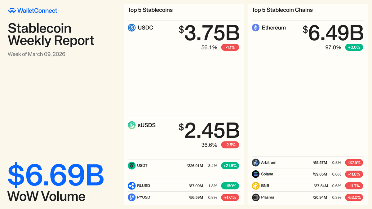 **Weekly stablecoin activity across the WalletConnect Network reached $6.69 billion**, according to the latest report. **Key highlights:** - USDC maintained its position as the leading stablecoin - Ethereum remained the dominant blockchain for transactions - Volume represents activity facilitated through WalletConnect's infrastructure The figures demonstrate continued strength in stablecoin usage, with USDC and Ethereum maintaining their market leadership positions. WalletConnect serves as critical infrastructure connecting wallets and applications in the stablecoin economy.