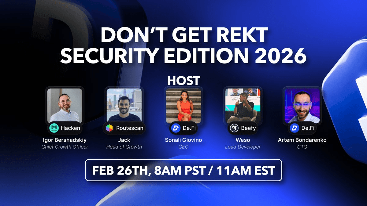 De.Fi is hosting a Twitter Spaces session on February 26th featuring security experts from Hacken, Routescan, Beefy Finance, and Artem DeFi. **Key Discussion Topics:** - Staying safe during bear market conditions - Protecting crypto assets from emerging threats - Strategic positioning in volatile markets - New attack vectors to watch The session brings together security auditors and DeFi protocol representatives to share practical advice on navigating challenging market conditions. [Join the Spaces session](https://x.com/i/spaces/1XGygmgmoYbxM?s=20)