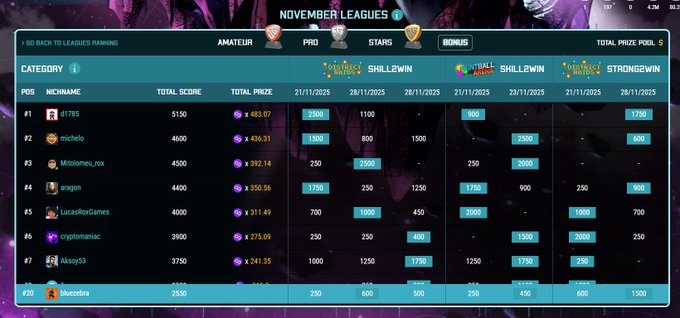 November Leagues - 3500USD馃槏 Congrats to all the winners in Leagues and tournaments. Socialgames prizes were 3500USD this month 馃コ Congrats @nachitockss56 @Mitolomeu Sadik Aksoy Memo Barrios Marc Kiwikaren D1785 Michelo & more Thanks to the streamers who are streaming & always