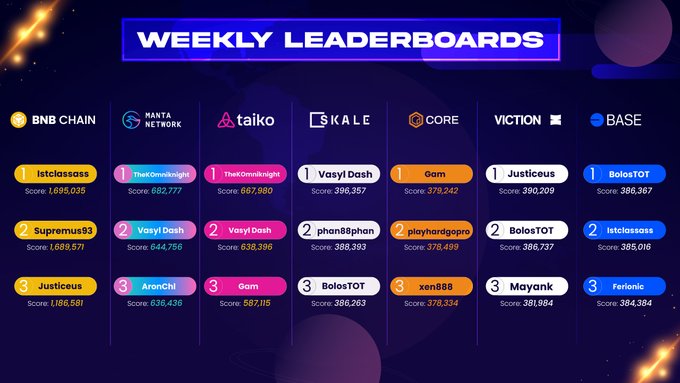 馃弳 World of Dypians Weekly Leaderboard Champions! 馃弳 Huge congrats to this week鈥檚 top scorers: - BNB Chain: lstclassass (1,695,035) - Manta Network: TheKOmniknight (682,777) - Taiko: TheKOmniknight (667,980) - SKALE: Vasyl Dash (396,357) - Core: Gam (379,242) - VICTION: