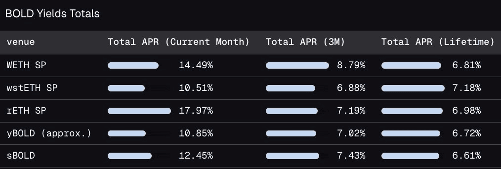 Liquidity providers can now earn **10% APR** by supplying BOLD/USDC pairs on [Uniswap V4](https://uniswap.org). **Key Details:** - Yield is paid out in BOLD tokens - Additional earnings from swap fees on top of base APR - Part of broader BOLD ecosystem offering 7%+ returns across multiple venues - Approximately $11M in liquidity across BOLD/stablecoin pairs enables large swaps **Alternative Options:** - LP BOLD/USDC on Ekubo Protocol or Uniswap: 8-11% APR in BOLD - Deposit BOLD into Stability Pools, sBOLD, or yBOLD for auto-compounding (~8% APR) The BOLD ecosystem positions itself as a low-risk yield opportunity for stablecoin holders.