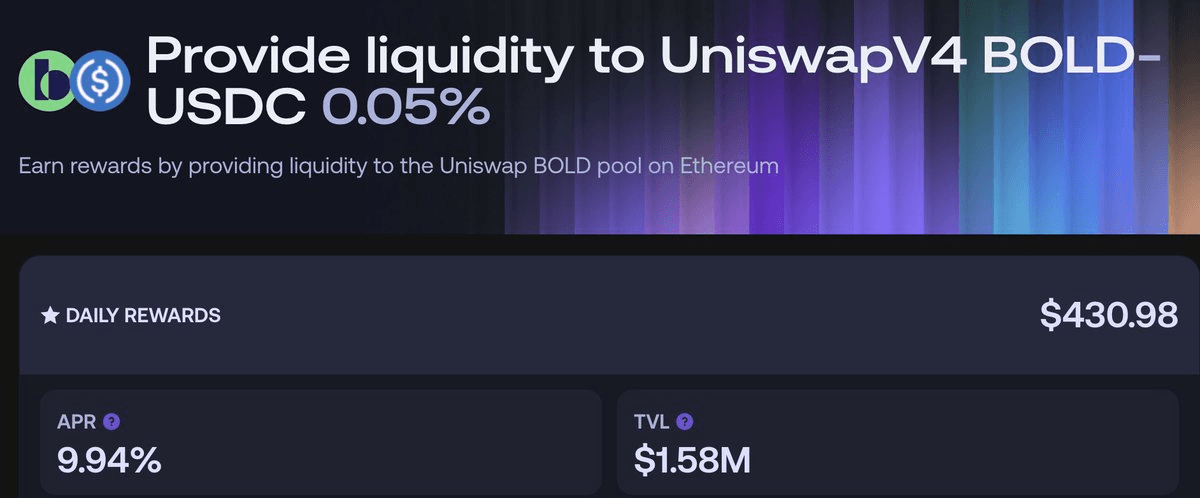 Uniswap V4 Offers 10% APR for BOLD/USDC Liquidity Providers Plus Swap Fees