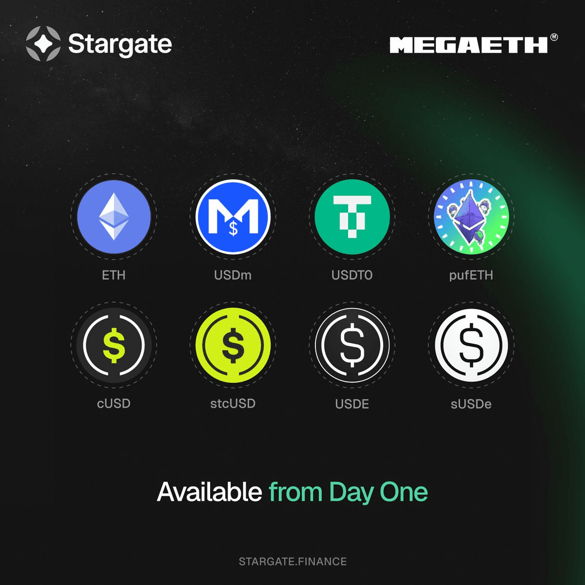 Stargate announces day-one integration with megaETH, supporting multiple tokens including: - ETH and USDm - USDT0 - pufETH (Puffer Finance) - cUSD and stcUSD (Cap Money) - USDE and sUSDe (Ethena Labs) The protocol will enable cross-chain liquidity transport for these assets on the new network from launch day.