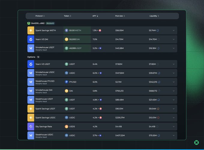 Now live: - @Yearn V3 - automated yield strategies that rotate between protocols to look for the best risk-adjusted returns - @SteakhouseFi @Morpho vaults - curated by the largest stablecoin risk curator on Morpho, institutional-grade risk management - @sparkdotfi Savings -