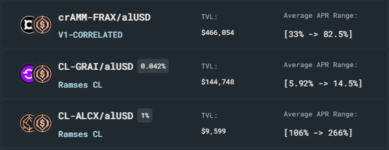 RamsesExchange alAsset pools on Arbitrum are currently offering high yields. Ramses is an efficient DEX that aims to be the native liquidity layer on Arbitrum. The alUSD is a synthetic debt asset of Alchemix, backed by the underlying stablecoin. GRAI is the debt token of Gravitaprotocol, enabling interest-free loans against LSTs. FRAX is a decentralized stablecoin pegged to the US dollar. Providing liquidity for these assets on RamsesExchange will reward with RAM and xoRAM tokens.