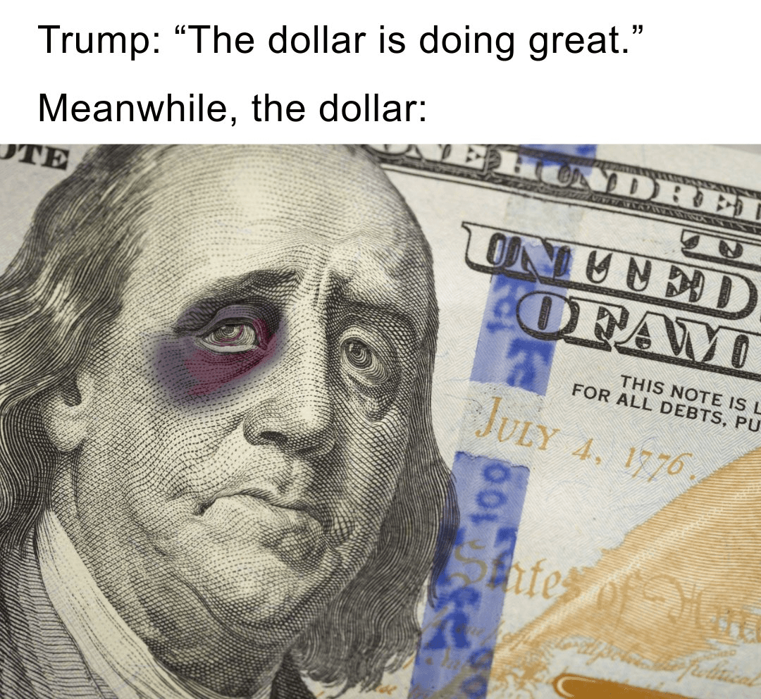 **Market Irony Strikes Again** The U.S. dollar experienced an immediate decline following President Trump's public statement that the currency is performing well. The incident highlights a recurring pattern where presidential reassurances about economic indicators often precede opposite market movements. **Key Points:** - Trump declared the dollar was doing great - Currency value dropped shortly after the statement - Pattern echoes previous Trump-related market volatility, including a 40% crypto plunge in 26 minutes last December The timing suggests markets may be reacting skeptically to official optimism, or that underlying economic concerns outweigh verbal reassurances. This follows a trend of Trump-related assets experiencing sharp volatility in response to public statements. [Read full analysis](https://wallstmemes.com/news/stonks/trump-just-said-the-dollar-is-doing-great-and-it-immediately-took-a-nose-dive/?utm_source=Twitter&utm_medium=Wallstmemes+-+Twitter&utm_campaign=Articles)