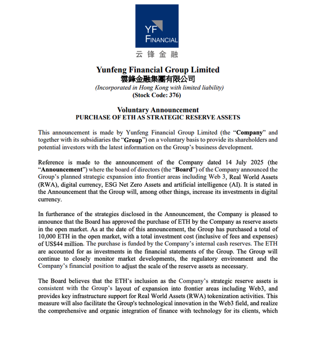 Yunfeng Financial has officially adopted ETH as a reserve asset, marking another step in institutional crypto adoption.