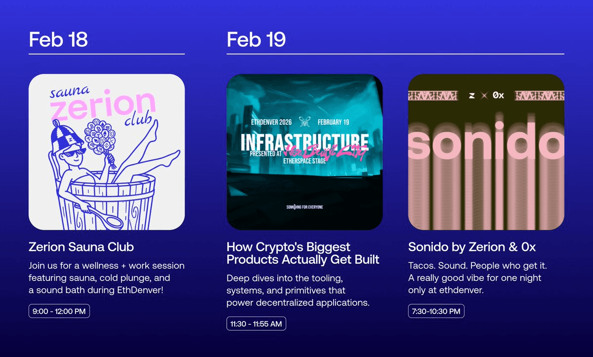Zerion hosted its inaugural Sauna House event at ETHDenver, featuring an unconventional format for crypto discussions. **Event Highlights:** - Combined cold plunge sessions with cryptocurrency hot takes - Alternative to traditional podcast studio conversations - Part of Zerion's broader ETHDenver presence **Additional ETHDenver Activities:** - Panel discussion: "How Crypto's Biggest Products Actually Get Built" featuring speaker Abishek (Feb 19, 11:30am) - Sonido event by Zerion & 0xProject (invite-only) The event represents a creative approach to networking and discussion at one of crypto's largest conferences.