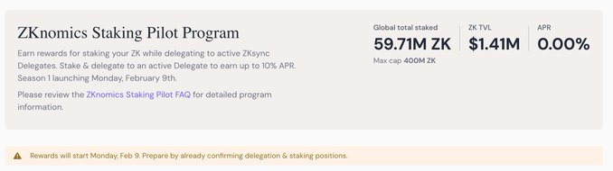 **ZKsync's ZKnomics Staking Pilot Program Season 1 begins Monday, February 9th at 10:00 AM ET.** Key details: - Rewards streaming starts February 9th, 10:00 AM ET - Season 1 duration: approximately 3 months - Total rewards pool: up to 10M $ZK tokens - Users can set up their staking positions now to be ready when rewards begin The program allows participants to stake $ZK tokens and earn rewards over the three-month period. Early preparation is encouraged to ensure readiness when the reward distribution commences. For more information and setup instructions, visit [ZKsync's official channels](https://zksync.io).